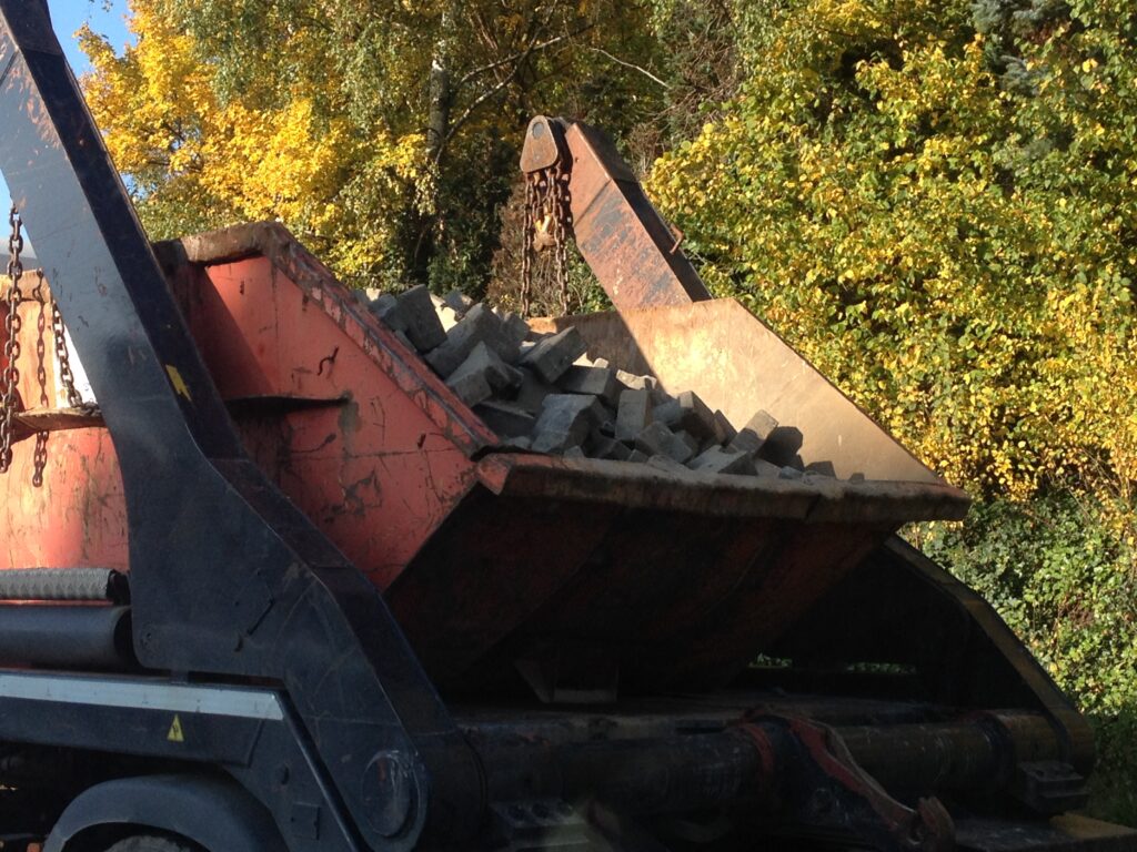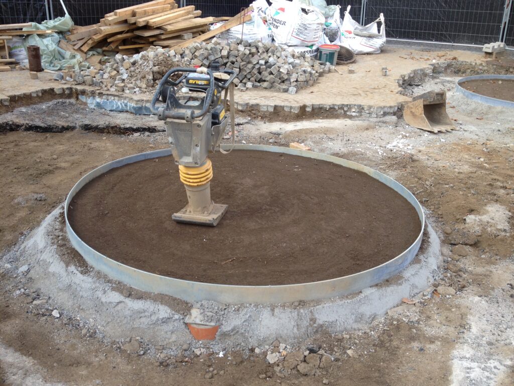 Der Aushub muss gründlich sein: Organisches Material, Wurzeln und lockerer Boden haben nichts im Untergrund zu suchen. Der verbleibende Boden wird mit einer Rüttelplatte verdichtet, bis er richtig fest ist. Darauf kommt die Tragschicht aus abgestuftem Schotter (0-32 mm oder 0-45 mm), die in Lagen von 10-15 cm eingebaut und jeweils verdichtet wird. Zwischen den Lagen immer wieder das Gefälle kontrollieren – später lässt sich nichts mehr korrigieren.